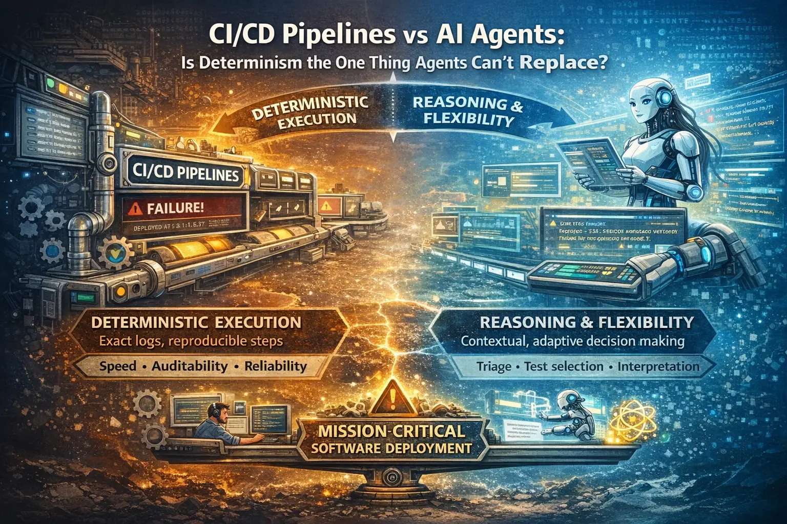 CI/CD pipelines are deterministic. AI agents can reason. Do we still need pipelines when agents can choose what to run and triage failures — or is determinism the one thing agents can't replace?